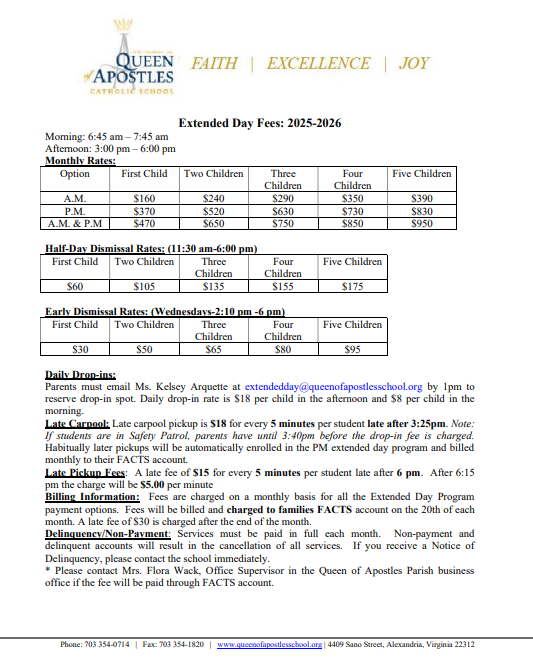 Our Extended Day program provides all students a safe, faith-filled, educational setting after school if parents cannot pick them up by regular dismissal time. Our facility is licensed by the state of Virginia. Registration is required for all families and will be billed through FACTS accounts.